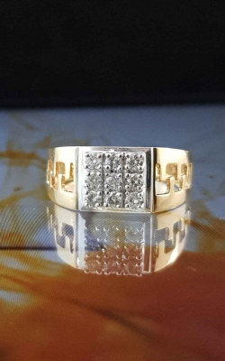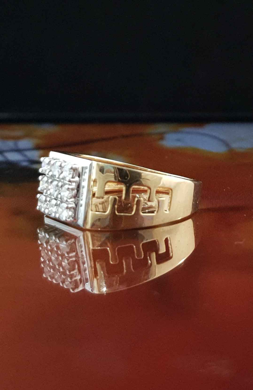 The ring have 3×3 diamond grid on an elevated white gold panel. The band of the ring have a wave design where gold is carved out.