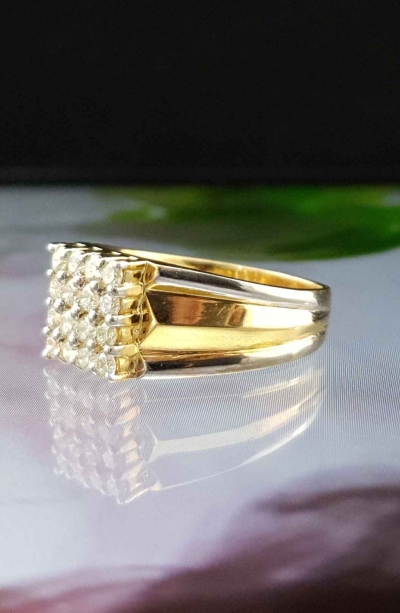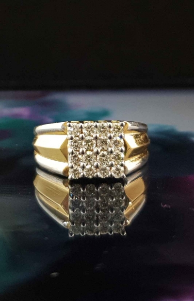 The ring have a grid of diamonds and the band have a triangular elevation at centre lined on both side by cylindrical white polish design.