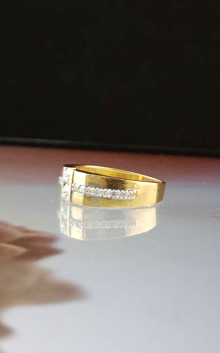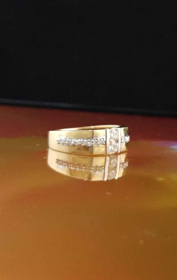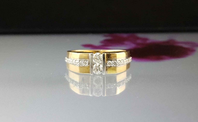 Two diamonds are between a channel of white gold border. Channel crosses a diamond row. The ring is in a unique design of a plateau.