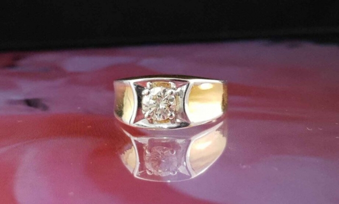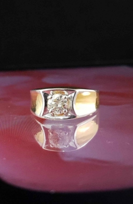The ring have a solitaire embedded in a white gold niche which is intruded by the gold band from either sides. The intrusion gives a curve to the niche giving it the look of a diamond drawn in waters enclosed by land from two sides.