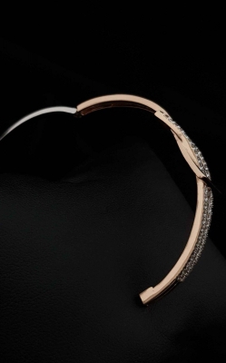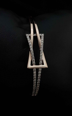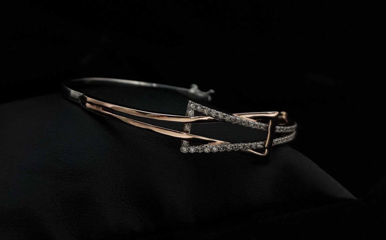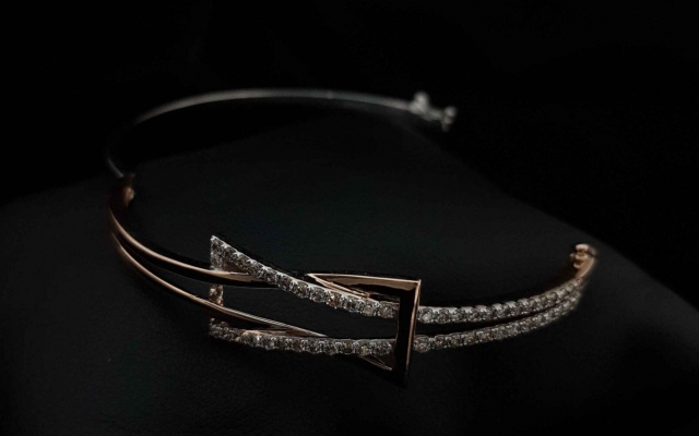 A diamond and a rose-gold triangle are entangled to make an elegant piece of jewellery.