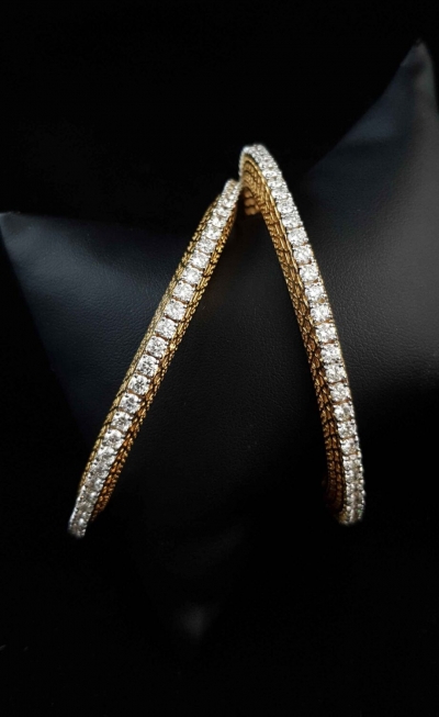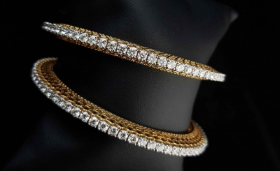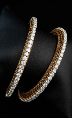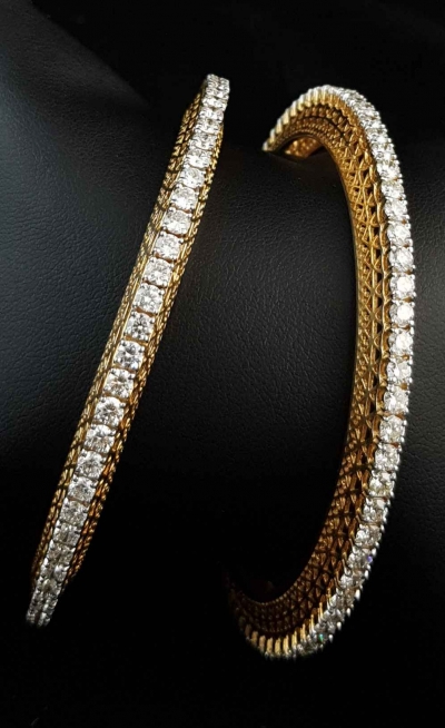 The bangles has a single-line of diamonds. The diamonds are on an elevated gold frame. The gold frame is inclined and have carvings on both sides.