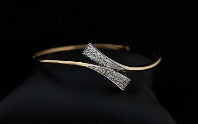 Two strands criss-crossing each other having diamonds set in a shape of a delta of a river.