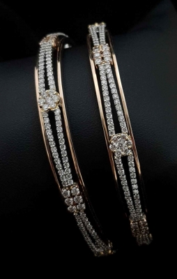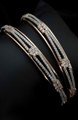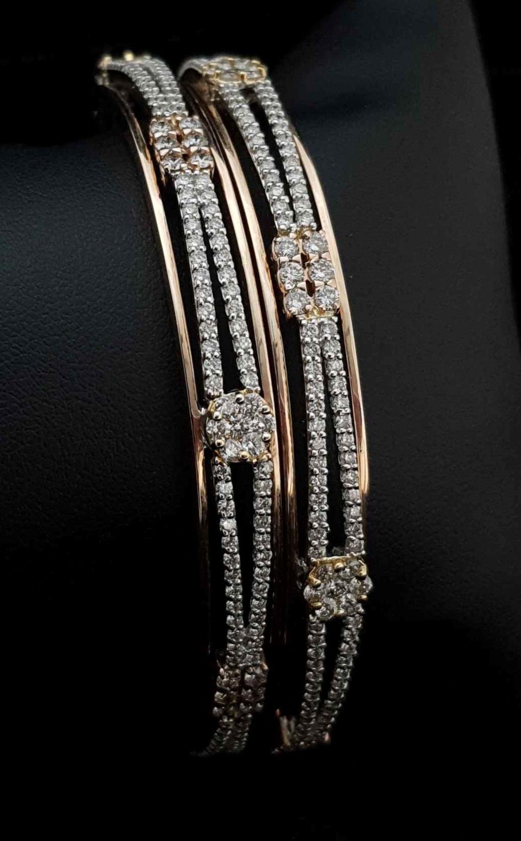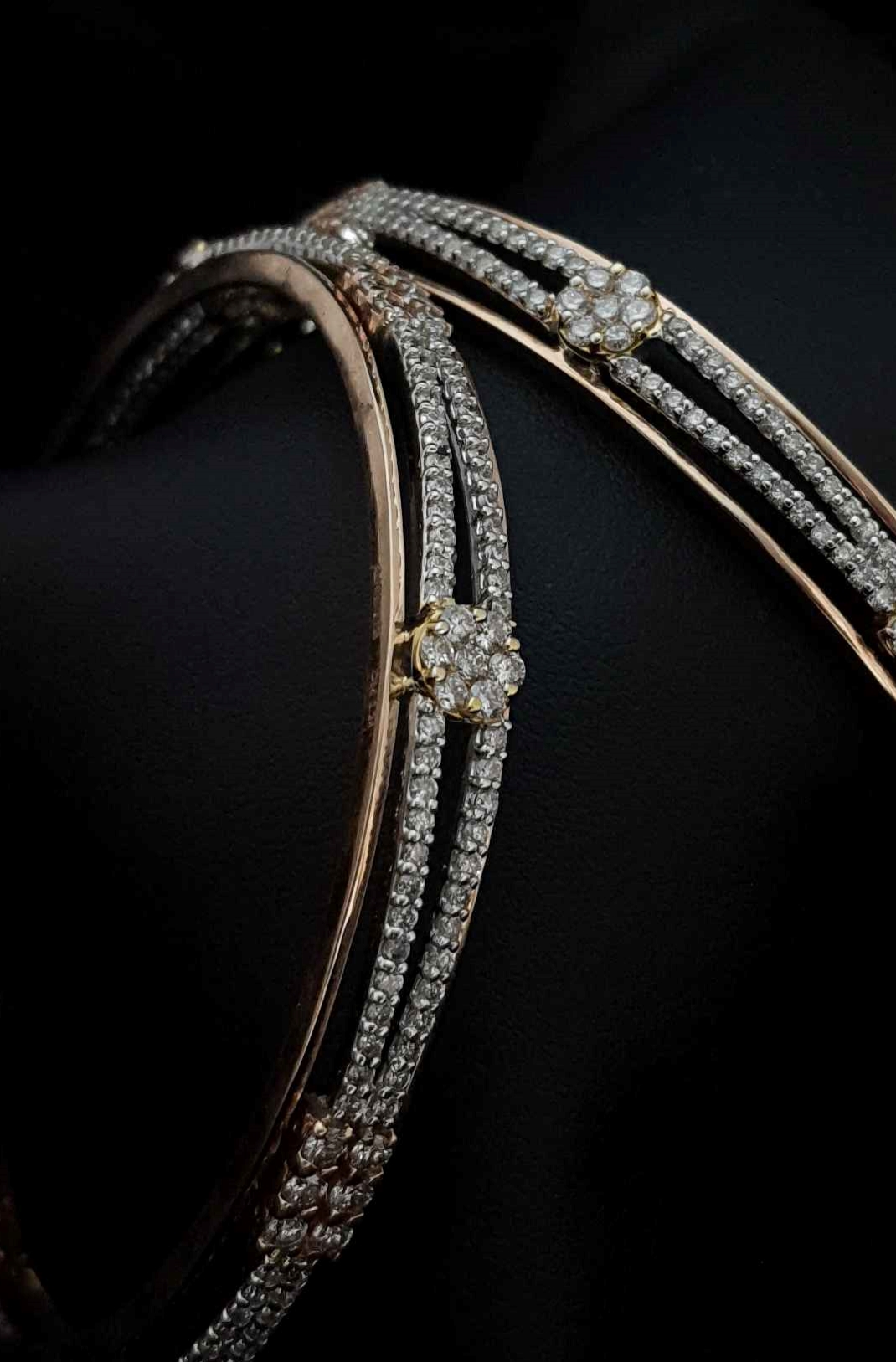 Two single-line wave of diamonds mingling on a rectangle 6 diamond rosegold batch and having a circular 7 diamond gold batch on separation of waves.