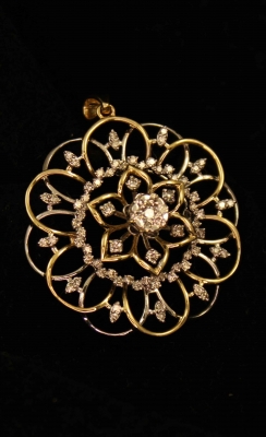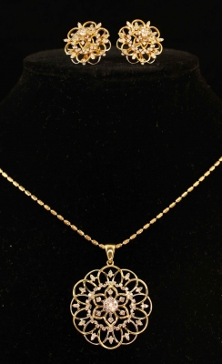 The pendent is flower shaped. The centre of pendent have a pressure-set clique which have a petal design surrounding it. This is surrounded by a circle of zig-zag arranged diamonds through which emerges up-down alternating petals. The earpiece have the same design, the pressure set clique is replaced by a single diamond.