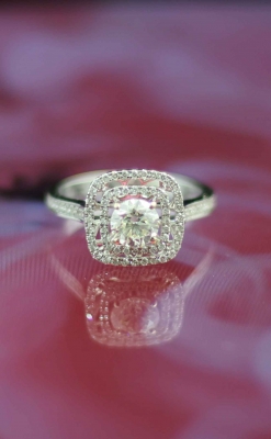 The ring has a solitaire piece in the centre, its surrounded by two descending diamond squircles. The sides of the band is lined with diamonds on both sides.